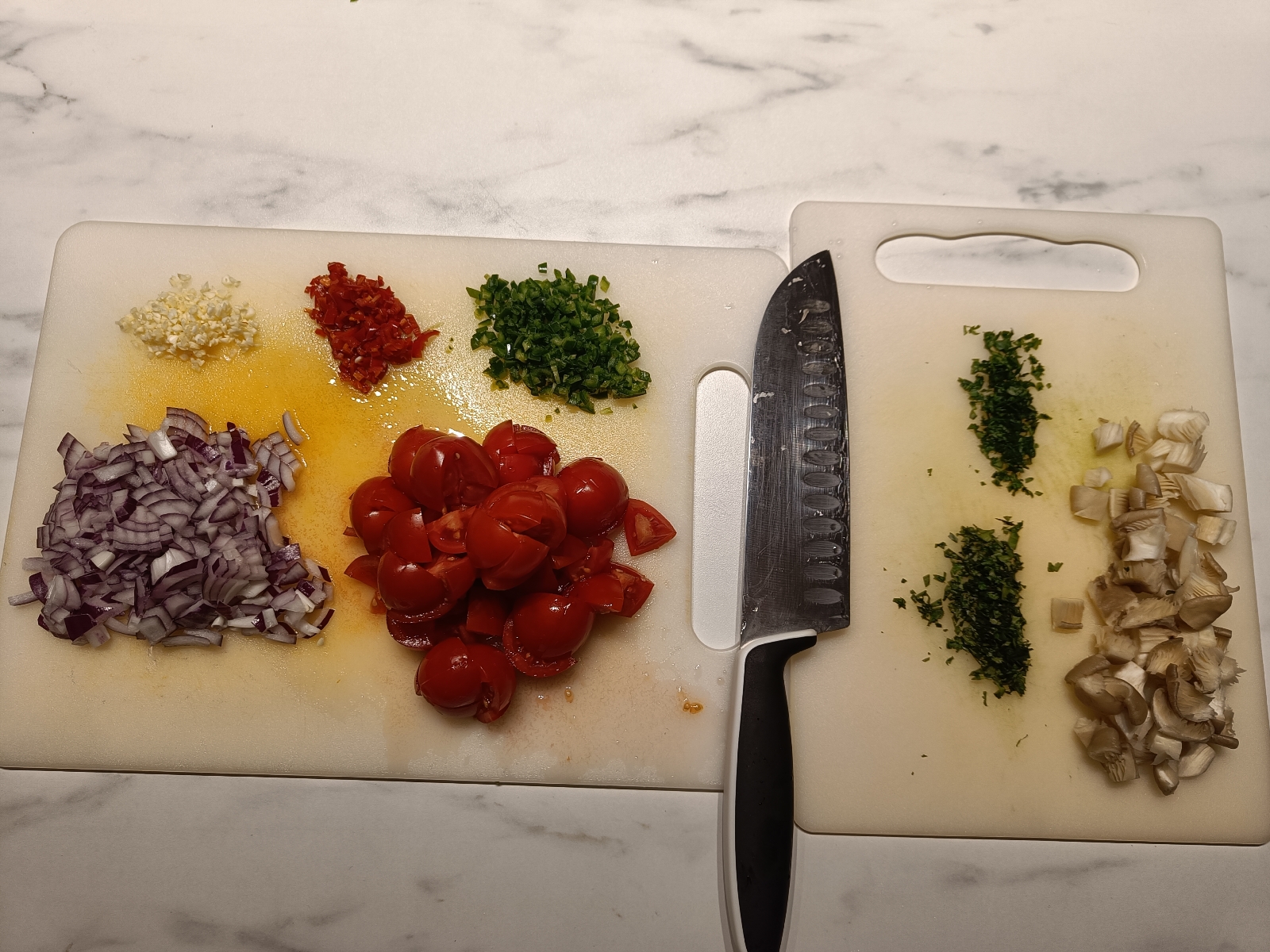 Finhakk så hvitløk, rød og grønn chili, rødløk, bladpersille og koriander, og skjær tomatene og soppen i terninger.