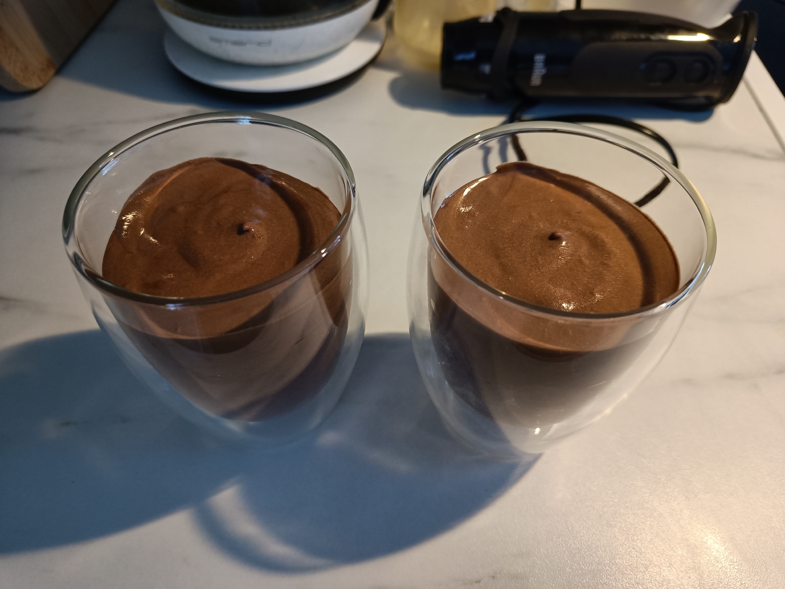 Du kan godt bruke mindre glass enn det jeg brukte og heller fordele på fire, da det ble veldig mektig med kun to. La så moussen stå i kjøleskapet i 2-4 timer. Denne moussen er ganske så fast i konsistensen.